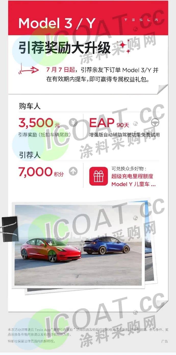 雖然中國汽車工業協會發布聲明從承諾書中刪除涉及“價格”表述,但在一些行業人士看來,價格戰是商業主體競爭的市場行為,汽車行業也不例外。諷刺的是,剛剛簽訂了協議,新能源汽車領軍者特斯拉于簽訂協議次日(7日)變相降價,7月7日起升級Model 3/Y引薦獎勵。成功引薦好友下訂并提車,購車人可獲得3500元引薦獎勵(可用于抵扣車輛尾款),90天EAP免費試用權,引薦人可享7000積分獎勵、可兌換超充額度、兒童學步車等。