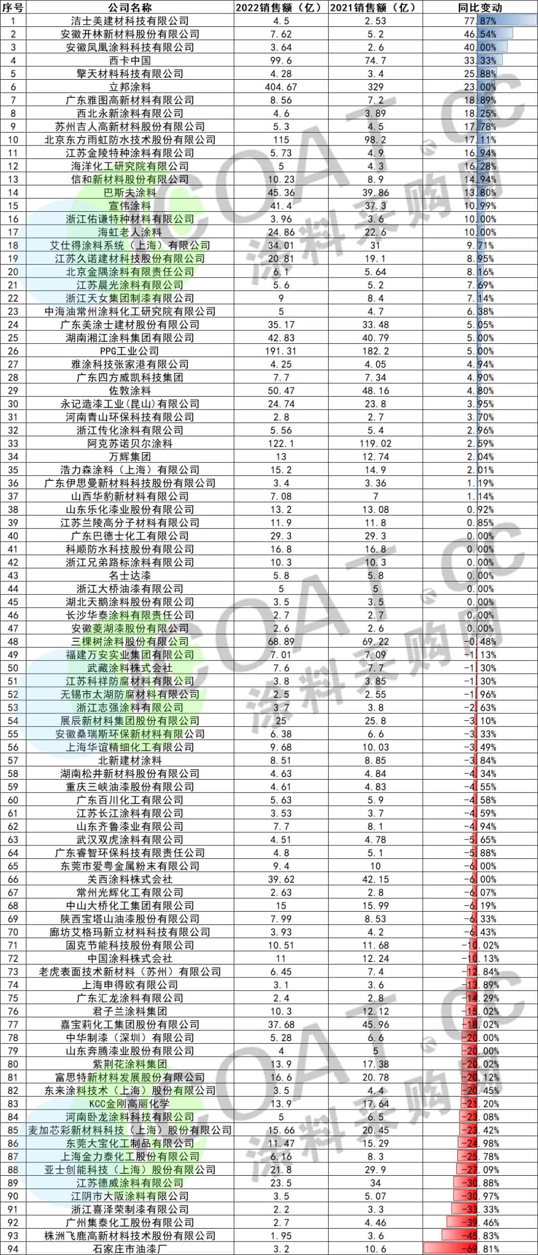 緊隨其后的是安徽開林新材料、安徽鳳凰涂料、西卡中國、擎天材料、立邦涂料、廣東雅圖高新材料、西北永新涂料、蘇州吉人高新材料、北京東方雨虹防水技術,增長比例分別為46.54%、40%、33.33%、25.88%、23%、18.89%、18.25%、17.78%、17.11%。
