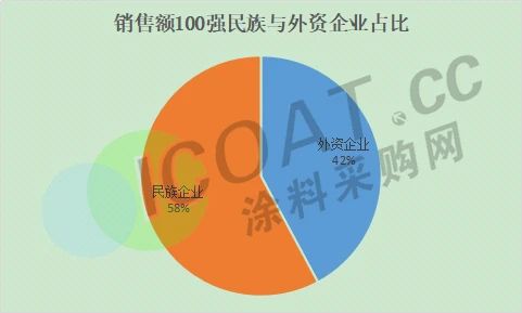 在銷售額100強中,僅7家外資涂料企業上榜,分別為阿克蘇諾貝爾涂料(中國)、艾仕得、立邦涂料有限公司(中國)、老虎新材料(中國)、PPG工業公司(中國)、宣偉(上海)涂料有限公司(中國)、佐敦涂料(中國),合計銷售額為850.41億元,占TOP100涂料企業總產量的42%。這也就意味著,民族涂料企業在100強銷售額中占比約為58%,即將突破6成。