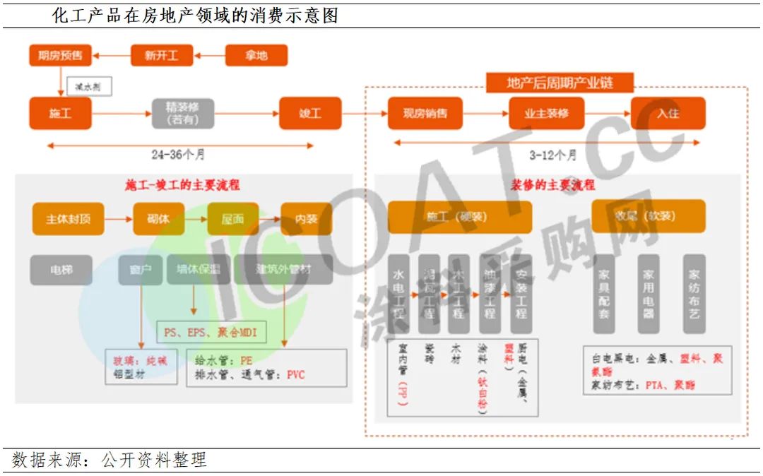 其中化工品的消耗幾乎貫穿于施工、竣工到裝修、入住的整個建設周期,PE、PVC等主要是建筑外管材的主要原料,而涂料、室內管主要應用在施工階段,兩者涉及鈦白粉、PP等眾多化工原料。此外,塑料、聚氨酯之于家電、化纖之于軟裝則是在裝修階段,屬于地產后周期產業鏈,兩階段對于化工品的涉及面則更加廣泛。