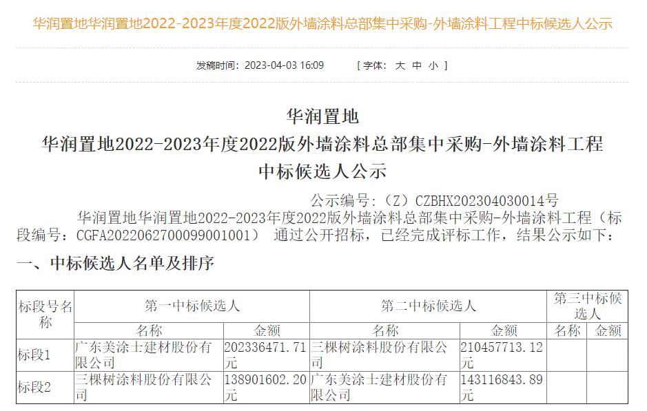 美涂士建材股份有限公司、三棵樹涂料股份有限公司成功中標華潤置地2022-2023年度2022版外墻涂料總部集中采購-外墻涂料工程。