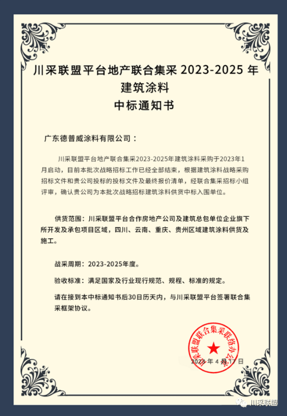 廣東德普威涂料有限公司、廣東巴德士新材料有限公司中標入圍川采聯盟平臺第三十二批次地產聯合集采建筑涂料戰略采購。