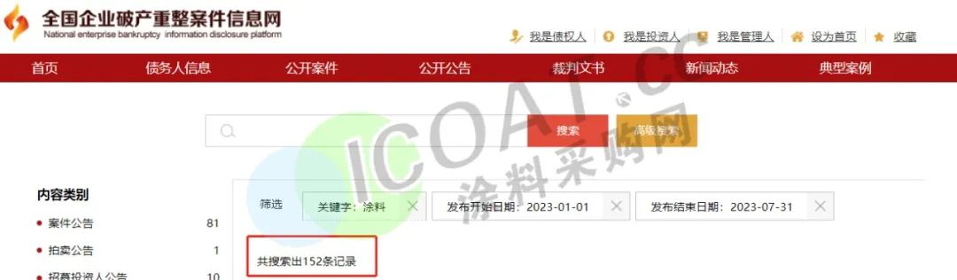 實際上,南方石化的破產重整在整個化工行業并不是稀奇事。據破產信息重整網,自2023年1月1日至7月31日,涂料行業破產重整案件152起,化工企業共1940起,這2000多家企業已經是“板上釘釘”的“涼涼”了,每一條公告背后,都是一個曾經鮮活且充滿競爭力的企業,卻在今年徹底淪為棄子。