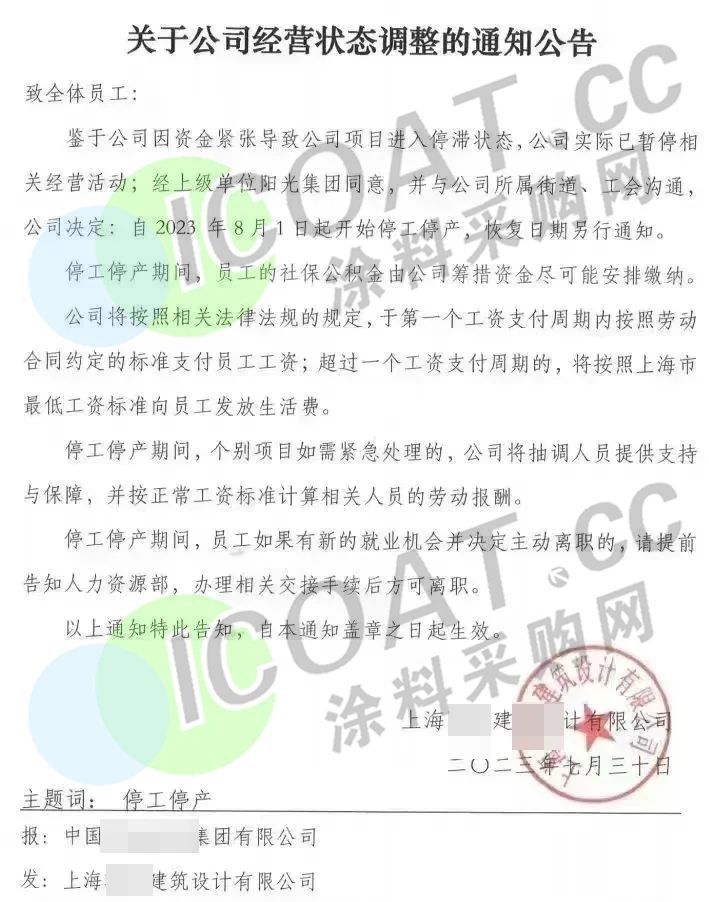 7月底,上海另一家建筑設計公司表示,由于資金緊張導致項目進入停止狀態,公司實際已暫停相關經營活動,決定自8月1日起開始停工停產。