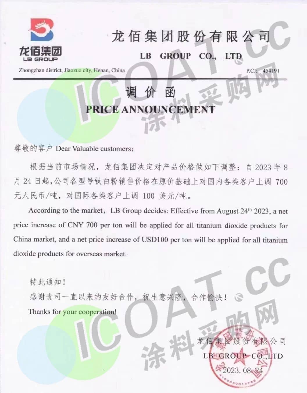 昨日(24日),龍佰集團發(fā)布調價函,稱8月24日起,各型號鈦白粉銷售價格在原價基礎上,對國內各類客戶上調700元/噸,對國際各類客戶上調100美元/噸。