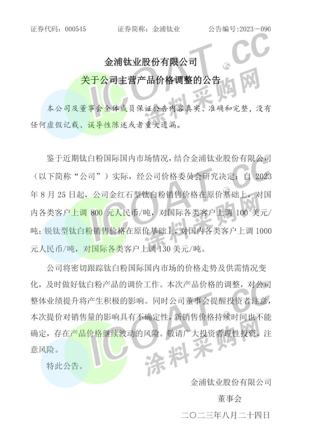 金浦鈦業(yè)表示,自8月25日起,金紅石型鈦白粉銷售價格在原價基礎上,對國內各類客戶上調800元/噸,對國際各類客戶上調100美元/噸;銳鈦型鈦白粉銷售價格在原價基礎上,對國內各類客戶上調1000元/噸,對國際各類客戶上調130美元/噸。