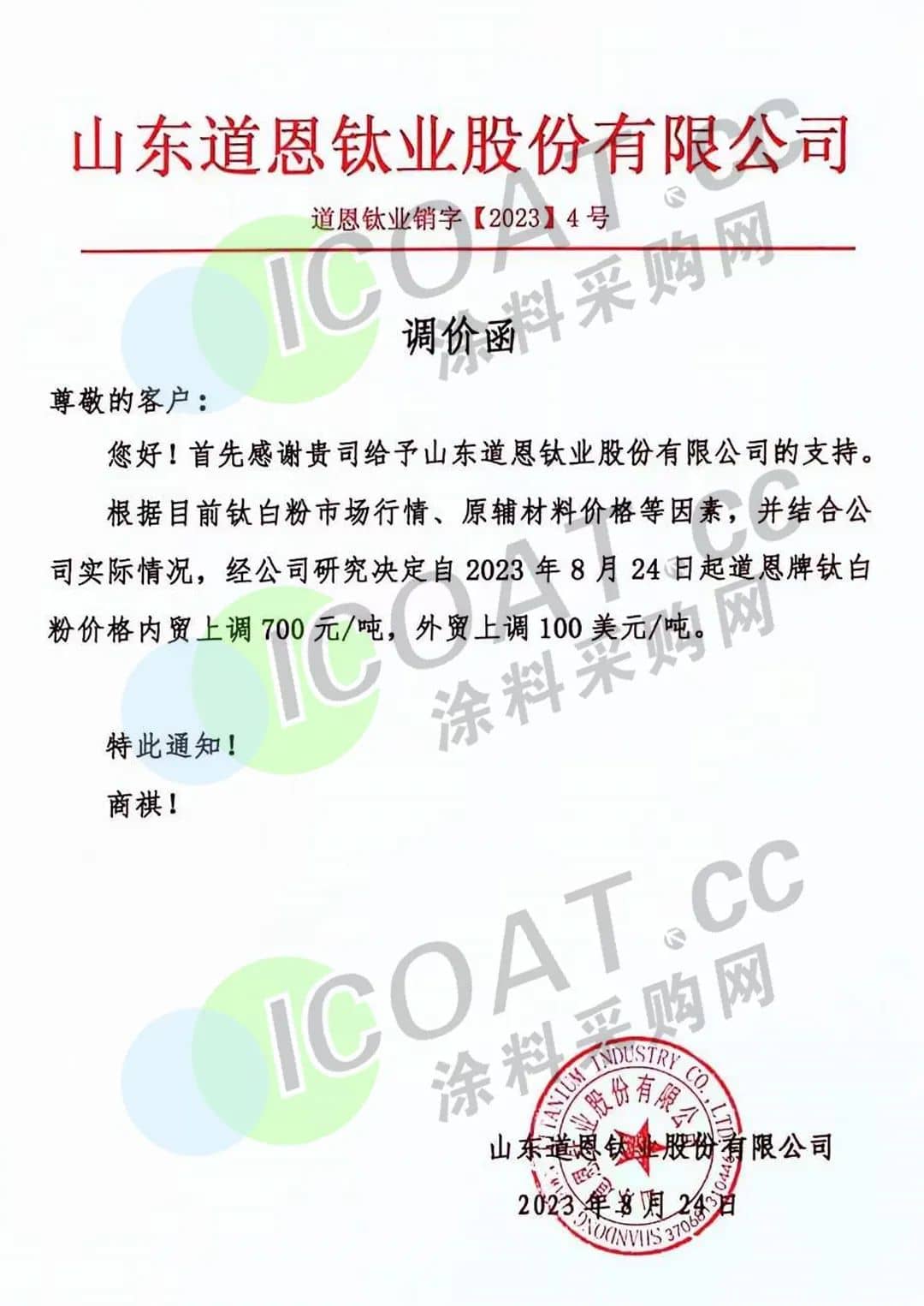 道恩鈦業(yè)表示,24日起,道恩牌鈦白粉價格內貿上調700元/噸,外貿上調100美元/噸。