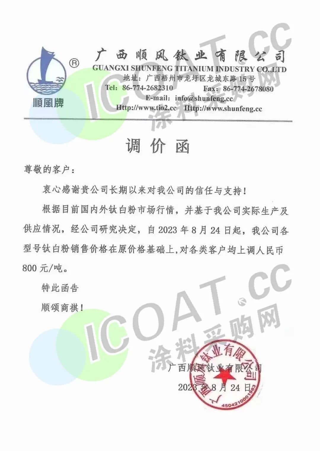 廣西順風鈦業(yè)表示,24日起,公司各型號鈦白粉銷售價格,各類用戶均上調800元/噸。