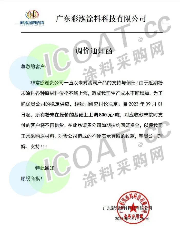 廣東彩泓涂料緊急宣布,自9月1日起,所有粉末在原價的基礎上上調800元/噸。且義正言辭的表示,對應收款未按時支付的客戶將不再供貨,懇請貴公司如期按約回籠資金。