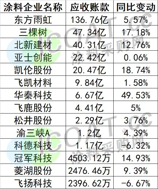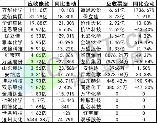 涂料采購網(wǎng)在涂料產(chǎn)業(yè)鏈上游原材料領(lǐng)域,和相關(guān)化工領(lǐng)域查閱了部分企業(yè)的業(yè)績發(fā)現(xiàn),應收賬款約216億,應收票據(jù)約22億,其中萬華化學、龍佰集團、華誼集團位居應收賬款前三名的位置,分別為111.6億、31.29億、19.88億。