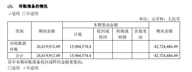 應收賬款壞賬準備期末余額為42,724,486.49元。