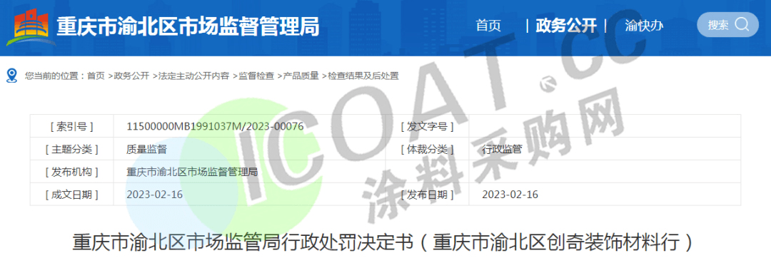 重慶市市場監(jiān)督管理局“重慶市渝北區(qū)創(chuàng)奇裝飾材料行”銷售的防水涂料進行質(zhì)量監(jiān)督抽查。經(jīng)抽樣檢驗,斷裂伸長率(無處理)、斷裂伸長率(加熱處理)不符合GB/T 23445-2009標準,沒收不合格的防水涂料2桶,沒收違法所得260.00元,罰款540.00元。