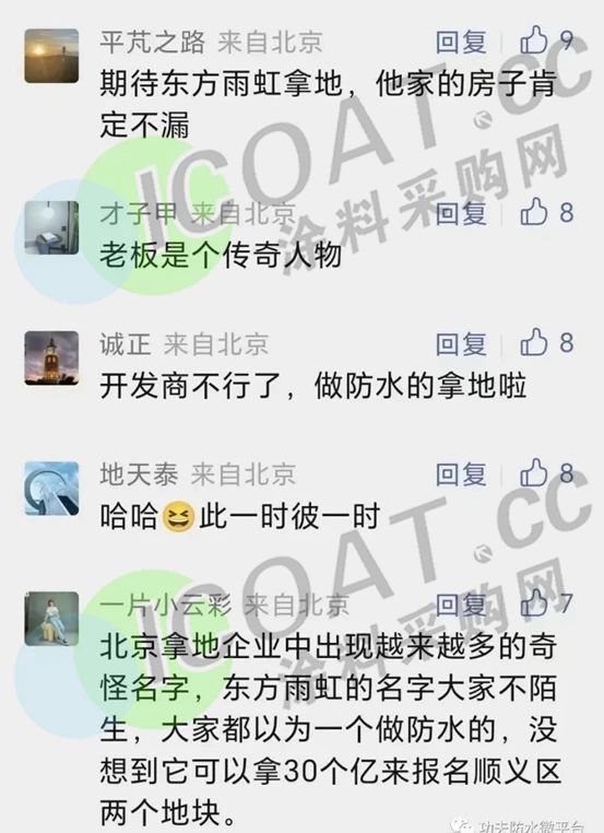 還有人懷疑,東方雨虹是在為某些房企做“馬甲”,增加中簽概率,從過往拿地“經驗”來看,東方雨虹拿地特點為總價低、規模小,但參與到北京的6次熱門地塊競拍卻一改之前風格,不得不讓人猜測,這背后是誰在操作,又是打的什么算盤。