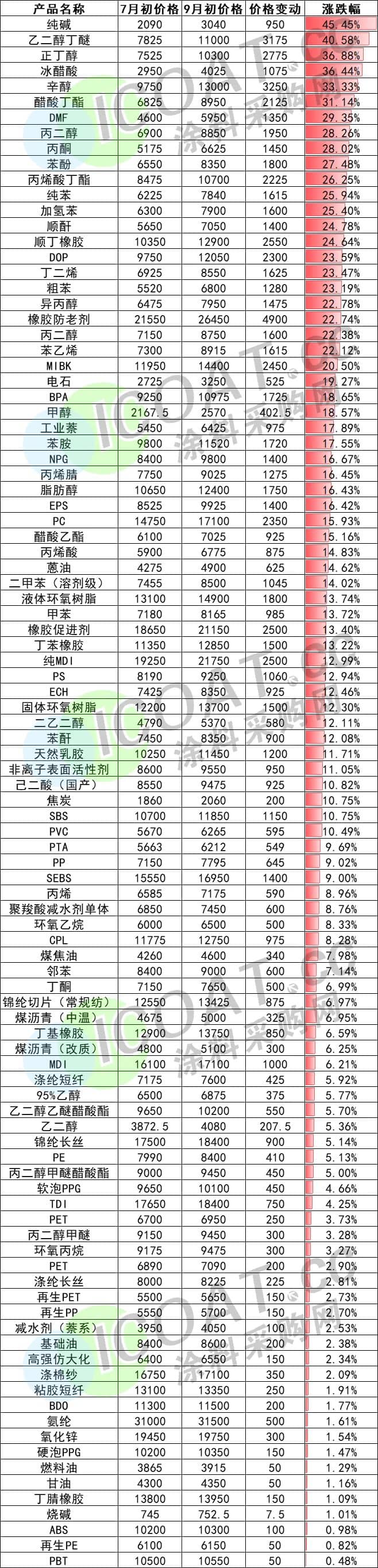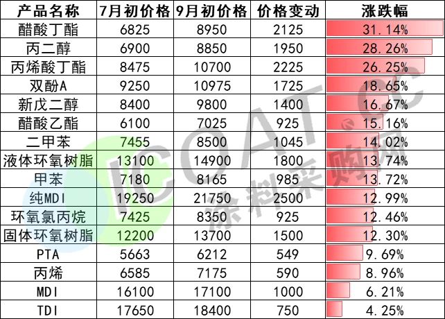 據涂料采購網了解,進入“金九”之后,90多種化工品報價較下半年7月初價格出現大幅上漲,部分化工品漲幅超過45%,噸價上漲最高約4900元/噸。