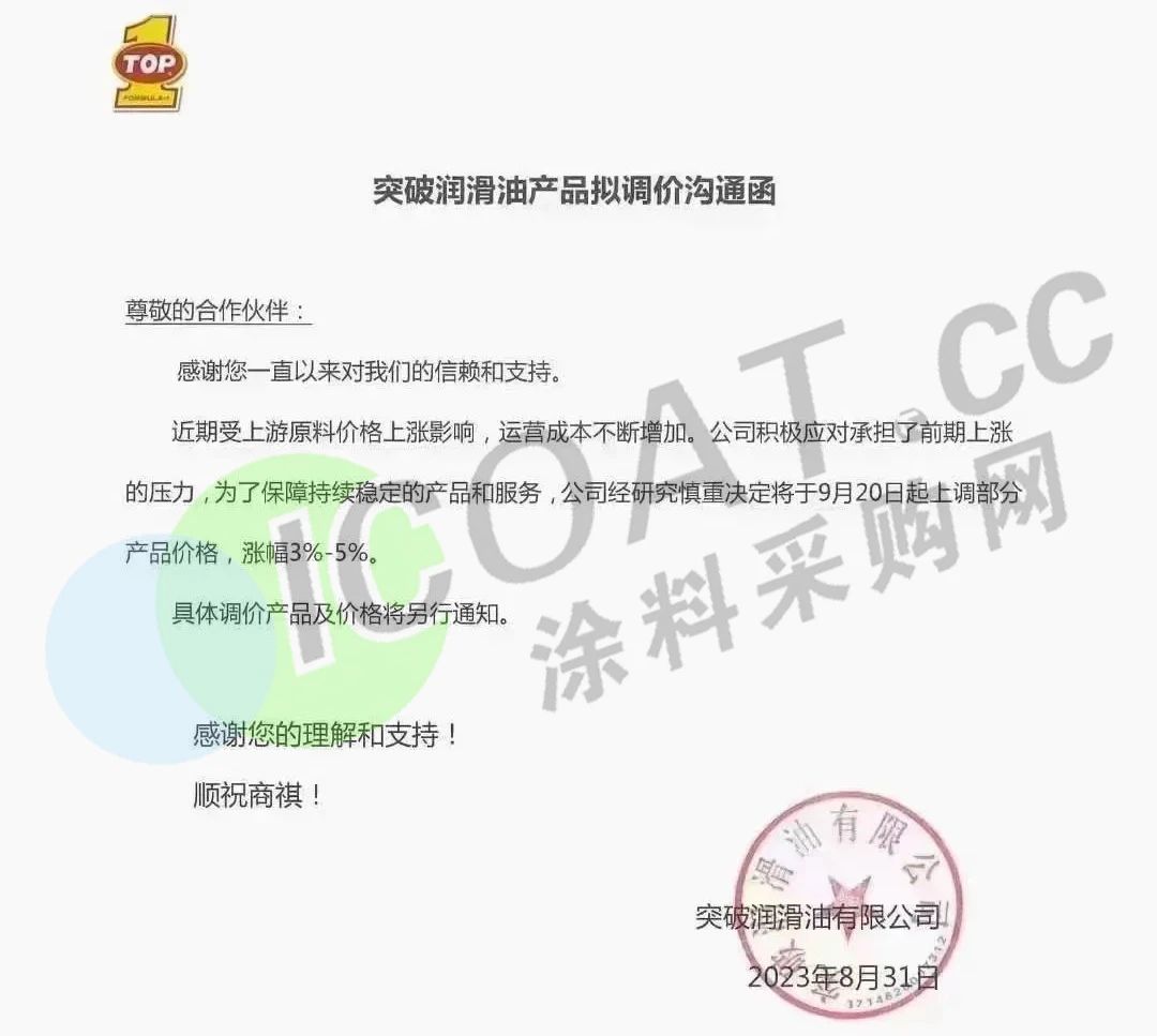 近日,勝牌、殼牌和突破潤滑油發(fā)布了關(guān)于調(diào)整潤滑油產(chǎn)品價(jià)格通告,宣布對(duì)產(chǎn)品價(jià)格進(jìn)行適度上調(diào),漲幅為5%左右。