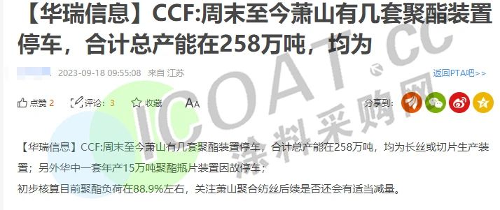 近日,網(wǎng)傳浙江蕭山因某大型活動(dòng),周末至今有幾套聚酯裝置停車,合計(jì)總產(chǎn)能在258萬噸,影響周期約20天左右,均為長絲或切片生產(chǎn)裝置,另外華中一套年產(chǎn)15萬噸聚酯瓶片裝置因故停車,初步核算目前聚酯負(fù)荷在88.9%左右。