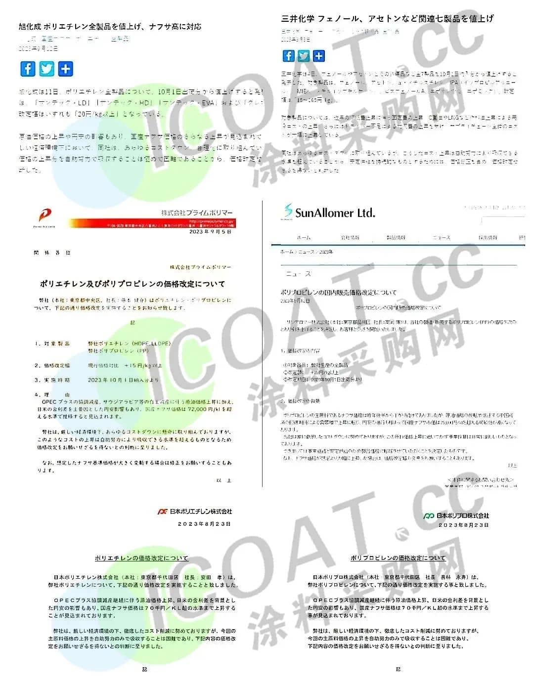 普瑞曼聚合物株式會社:自10月1日起聚乙烯(HDPE,LLDPE)和聚丙烯(PP)產品調漲15日元/kg以上。