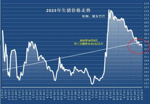 10月9日,國內生豬均價僅有15.61元/公斤,較前一日下降0.12元,比9月初下降了8.7%,相比雙節期間15.9元/公斤的價格回落了0.31元/公斤。