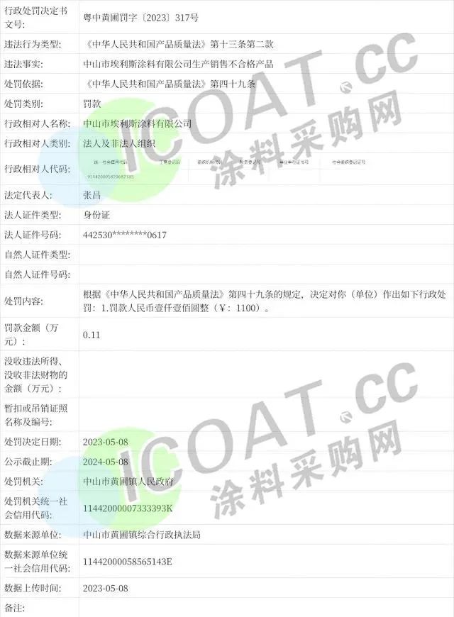 中山市埃利斯涂料有限公司因生產銷售不合格產品,被罰款0.11萬元。