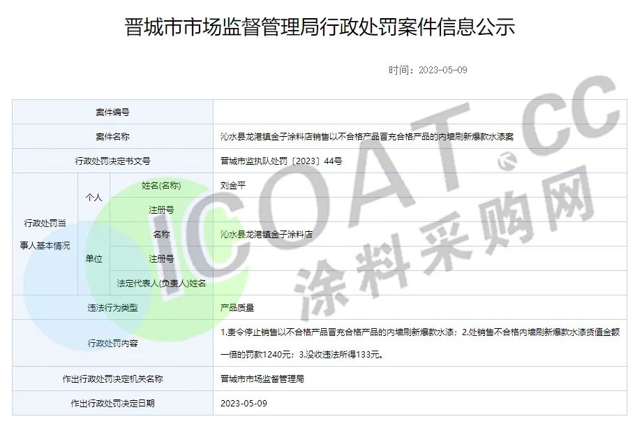 沁水縣龍港鎮金子涂料店因銷售不合格產品冒充合格產品的內墻刷新爆款水漆,被罰款1240元,沒收違法所得133元。