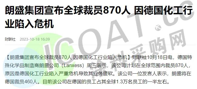 近日,德國化工巨頭朗盛發言人表示,由于德國化工行業深陷危機導致業務疲軟,計劃在全球范圍內裁員870人,其中在德國地區裁員460人。早在今年8月份,朗盛宣布通過降本增效行動計劃應對疲軟的經濟發展階段,并通過一次性降低成本并減少投資。