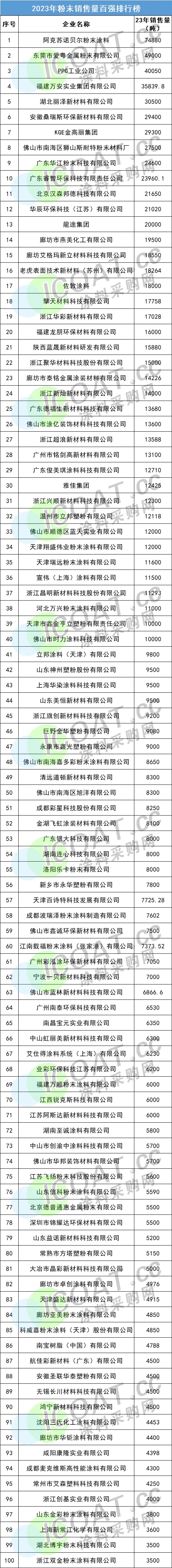 前三名分別為阿克蘇諾貝爾粉末涂料、東莞市愛粵金屬粉末有限公司、PPG工業公司。截至目前,阿克蘇諾貝爾粉末涂料已連續8年蟬聯百強之首的寶座,同比22年增長了4.5%。緊隨其后的是東莞市愛粵金屬粉末,銷售量49000噸,第三名則是PPG工業公司,銷售量為40050噸。