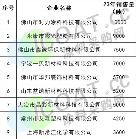 2023年粉末涂料百強榜單中有9家新企業登榜,占總數9%,銷量共計57250噸,占百強總銷量的4.84%。前三名分別為佛山市時力涂料科技有限公司(10000噸)、永康市鑫光塑粉有限公司(9000噸)、佛山市鑫誠環保新材料有限公司(7500噸),在粉末百強銷售量榜中分別排名40、47、59位。