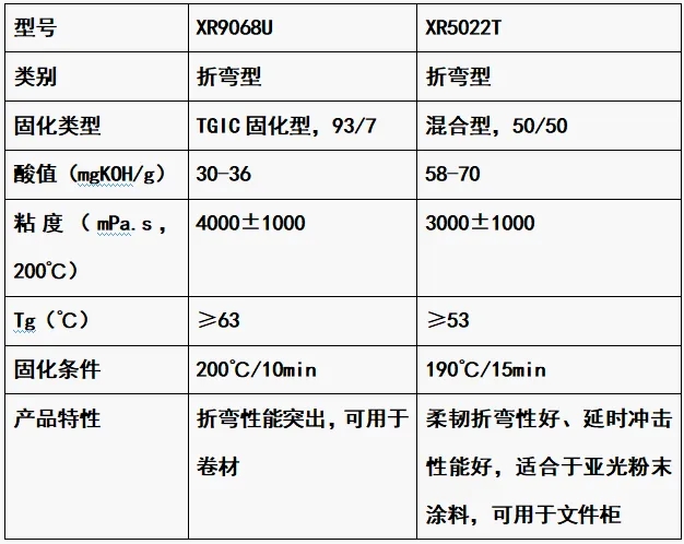 XR9068U折彎型樹脂是一種反應活性較快的樹脂,粘度適中,Tg較高,分子鏈比較柔性,具有優(yōu)良的耐候、良好的機械性能以及極佳的柔韌性,已規(guī)模用于卷材涂料;XR5022T延時折彎型樹脂的反應活性適中,粘度適中,分子鏈比較柔性,分子量比較大,具有良好的消光效果。該產(chǎn)品柔韌折彎性好、延時沖擊性能好,適合于亞光粉末涂料,板面細膩度好。