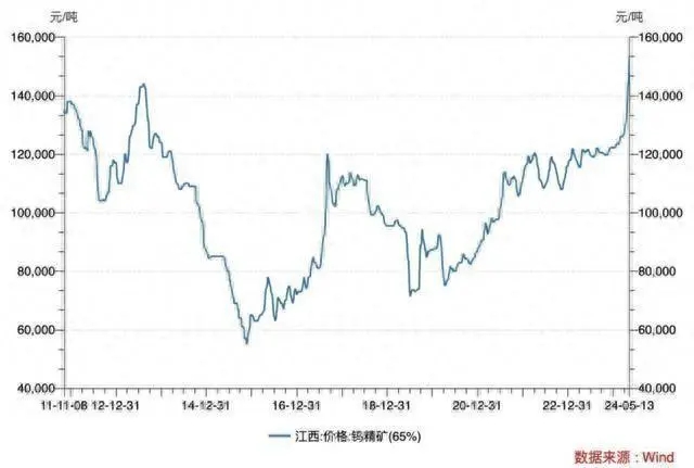 小金屬方面,年初至今,鉬精礦(45%-50%)上漲17.4%,錫上漲24.9%。被譽為“工業牙齒”的能源金屬鎢的價格在近期沖上了十年新高。江西地區65%品位的鎢精礦在5月13日的均價達到了15.35萬元/噸,較年初已上漲25%,創下了自2013年以來的新高。
