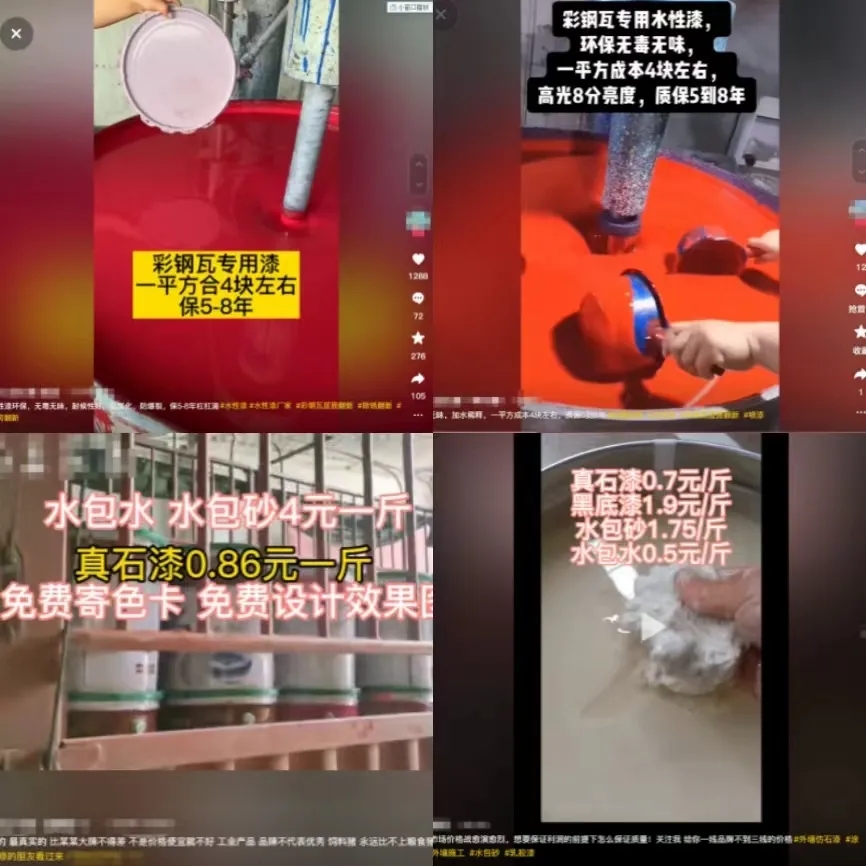 此外還有1元/公斤的工程漆、一平方米成本4元的水性工業(yè)漆、包工包料8元/平米的彩鋼瓦漆、以及8毛錢(qián)左右的真石漆、5元/公斤的鋼結(jié)構(gòu)水漆,號(hào)稱質(zhì)保8年,但這背后卻是起泡褪色,只起到了裝飾作用,卻沒(méi)有為工件起到保護(hù)作用。