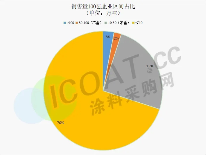 這也能夠看出,目前涂料行業的企業布局呈現金字塔模型,頭部企業較少,但是占據了100強總銷量的半壁江山,手中握著大量高品質資源。金字塔底部的企業最多,占據了7成左右,但僅占總銷量的13%左右,其余的中部企業占銷量榜約30%。這還僅僅是整個涂料行業銷量100強的數據,如果從整個涂料行業幾千家企業來看,頭部100家企業的總銷量也將占據較大比例。