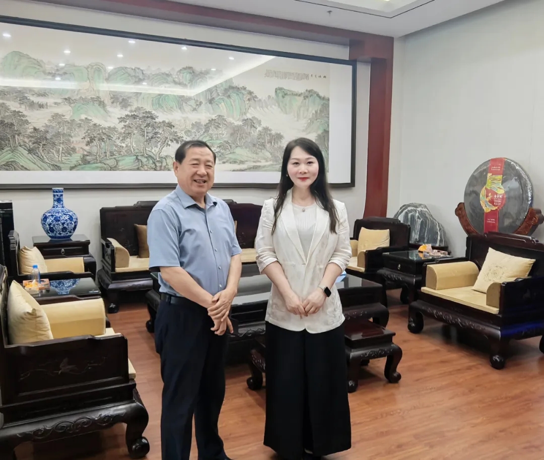 涂料采購網江雪(右)與永安集團董事長趙洪千(左)深入交流