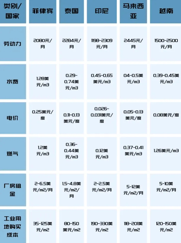 也就是說,國內(nèi)企業(yè)出海東盟,看好的包括東盟地理位置優(yōu)越,市場規(guī)模較大,以及稅收方面的減免利好,能夠為中國企業(yè)提供多元化的投資選擇,有著優(yōu)良的地理優(yōu)勢。與此同時,東南亞國家的用工成本和綜合成本也較低,體現(xiàn)在土地、人工、水電等多個方面。