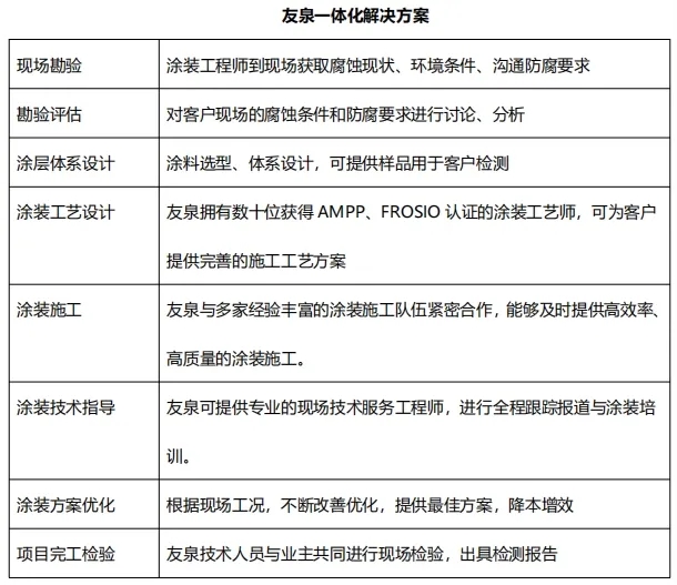 在重防腐領域,友泉新材料秉承全生命周期防腐解決方案。這一方案涵蓋了從目標設定、腐蝕源分析、材料選擇、技術應用、設計制造到驗收使用、測試檢驗、維護保養(yǎng)、維修延壽直至最終報廢的全過程。友泉新材料堅持整體性、系統(tǒng)性的原則,確保防腐工程的相互協(xié)調(diào)和優(yōu)化,以實現(xiàn)安全、經(jīng)濟和社會效益的最大化。