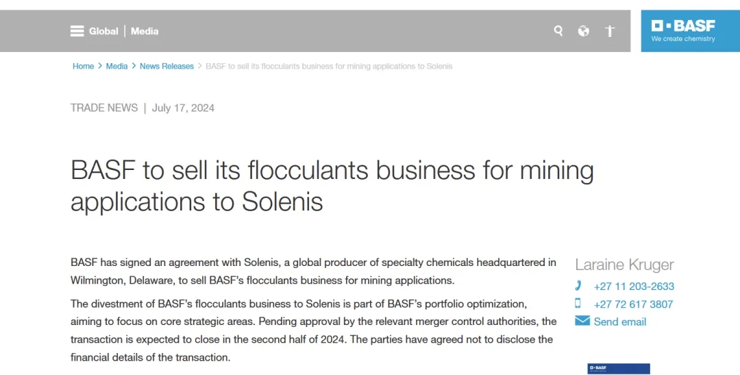巴斯夫宣布,將用于采礦的絮凝劑業(yè)務(wù)出售給美國(guó)特種化學(xué)品生產(chǎn)商索理思。而在1個(gè)月以前,巴斯夫宣布已將其位于美國(guó)圣地亞哥的Spartec®生物能源酶業(yè)務(wù)出售給拉曼集團(tuán)的子公司Danstar Ferment AG和Lallemand Specialties Inc。