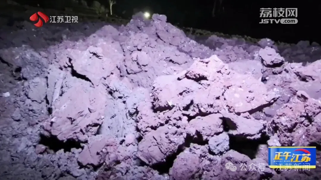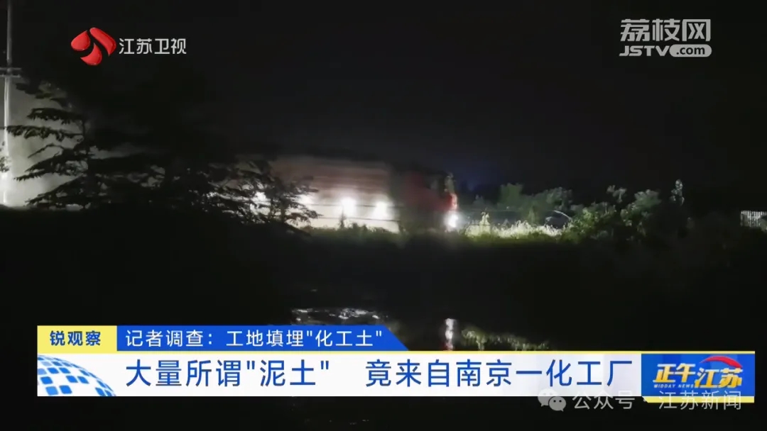 記者近日夜間來(lái)到北沿江高鐵南京浦口永寧段的施工現(xiàn)場(chǎng)看到,多輛載重卡車(chē)駛?cè)脒@處工地,將裝載的物質(zhì)倒入坑中進(jìn)行填埋。車(chē)上卸下來(lái)的是顏色發(fā)紅類(lèi)似于泥土的物質(zhì),有淡淡的刺鼻味道。