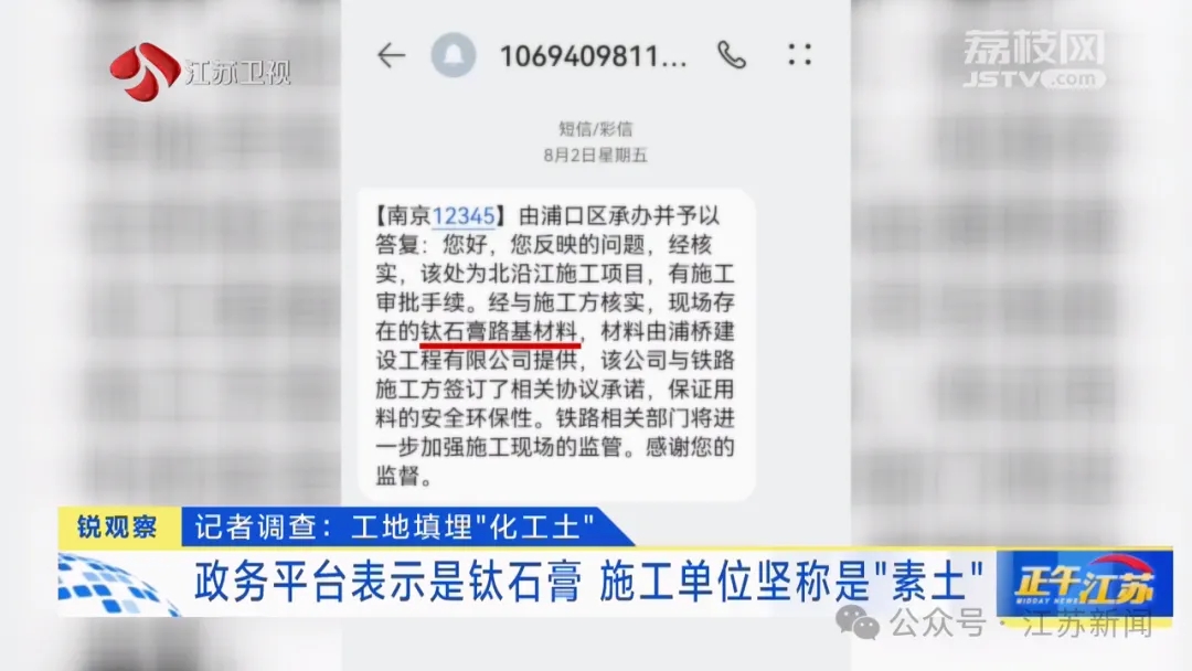 知情人說(shuō),為了防止有毒有害物質(zhì)被填埋進(jìn)地下,產(chǎn)生環(huán)境污染,他曾經(jīng)將這處高鐵工地填埋鈦石膏的情況反映到南京市12345政務(wù)服務(wù)熱線。熱線平臺(tái)給他的回復(fù)是,該處工地為北沿江高鐵施工項(xiàng)目,現(xiàn)場(chǎng)存在的鈦石膏路基材料由浦橋建設(shè)工程公司提供,該公司與鐵路施工方簽訂協(xié)議承諾,保證用料的安全環(huán)保性。