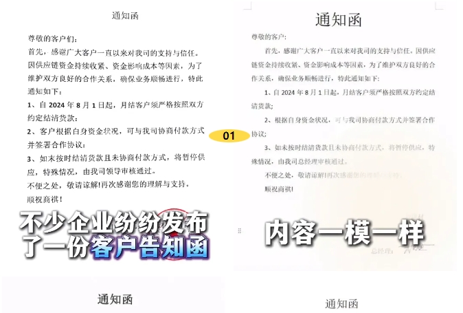 眾多企業(yè)的通知函中都提到了“月結(jié)客戶”,月結(jié)支付方式通常適用于那些交易頻繁、合作關(guān)系穩(wěn)定的行業(yè),允許買方在每個月的固定日期與賣方進(jìn)行一次款項結(jié)算,在工業(yè)制造業(yè)、批發(fā)、物流等行業(yè)廣泛應(yīng)用,幫助雙方簡化流程。