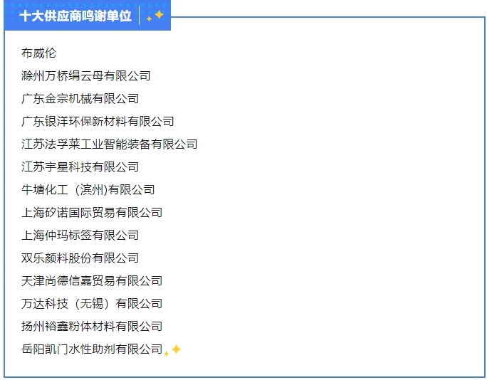 此次評選活動的成功舉辦,不僅是一次對行業優秀供應商的全面盤點,更是一次對涂料行業綠色、創新、可持續發展路徑的深度探索。為涂料企業在選擇供應商時提供了參考依據,更用實際行動為建筑工業等民生大計提供更好的保障。這些優秀供應商,代表著各領域的頂尖水平,未來也將繼續引領行業發展,與產業鏈上的企業共同繪制涂料行業的美好未來。