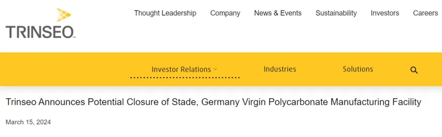 盛禧奧:可能將德國施塔德(Stade)的聚碳酸酯(PC)生產基地關閉。