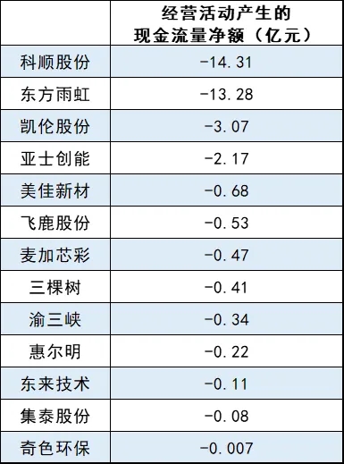 據上市公司財報數據,東方雨虹、凱倫股份等現金流低至負的億元級別。而飛鹿股份、渝三峽、惠爾明等上市公司和新三板企業的現金流則低至負的萬元級別。這是企業財務狀況不良的信號,意味著企業實際運營業務的現金流量不足以支付當前的應收賬款、應付賬款和其他運營成本,可見現金流緊張的情況。