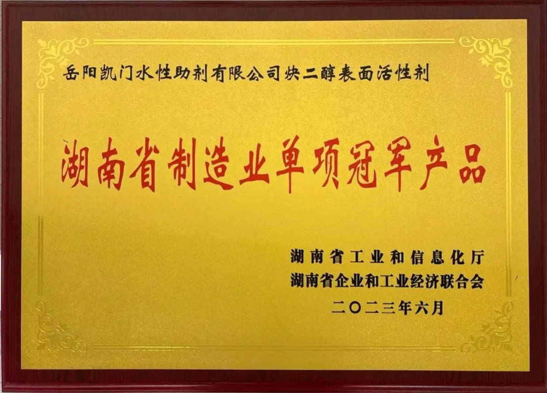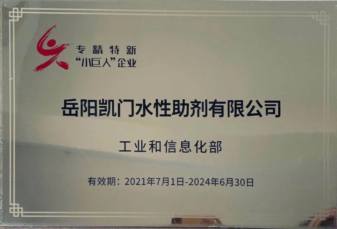 2021年,凱門助劑榮獲國家級專精特新“小巨人”企業榮譽稱號,始終專注于助劑領域的深耕細作,致力于為客戶提供高品質、高性能的助劑產品,不斷推動技術創新和產品升級,成功研發出多項核心技術,在市場上取得了廣泛應用和高度認可。2023年,企業研發的炔二醇表面活性劑榮獲湖南省制造業單項冠軍產品。