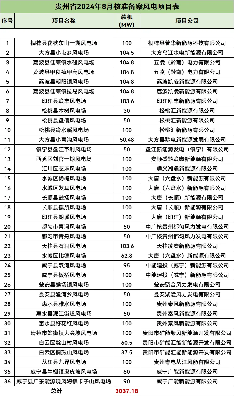 貴州核準36個風電項目,總規模3037.18MW,均為陸上風電項目。