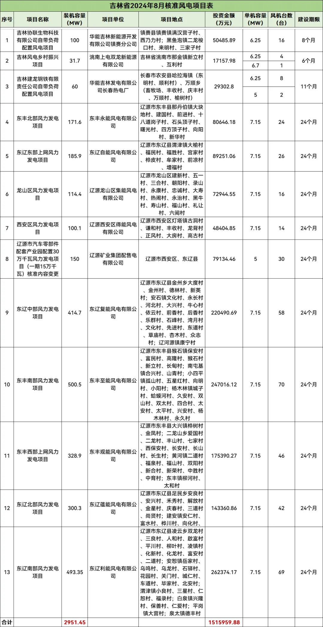 8月份,吉林共計核準13個風電項目,總規模2951.45MW,總投資1515959.88萬元,均為陸上風電項目。