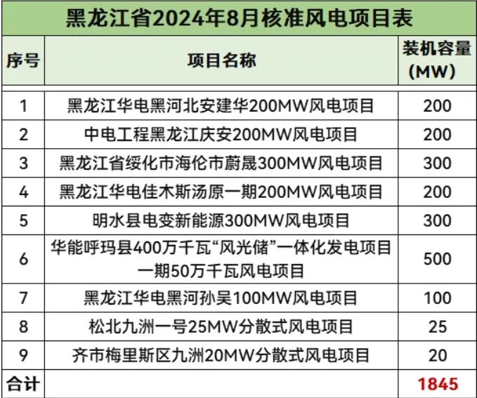 8月份,黑龍江共計核準9個風電項目,總規模1845MW。