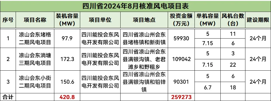 四川核準3個風電項目,總規模420.8MW,總投資259273萬元,均為陸上風電項目。