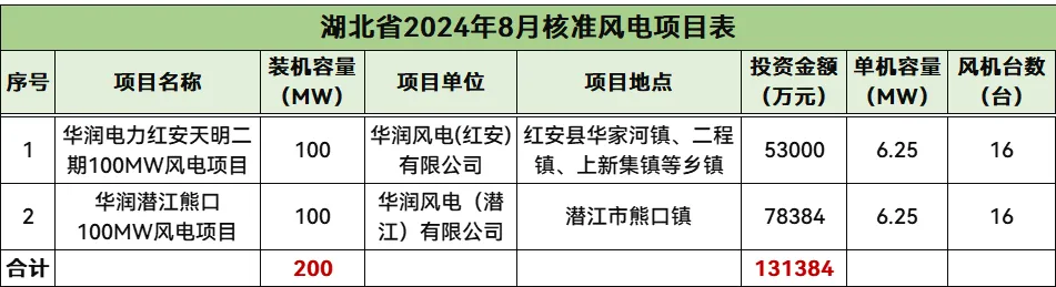 8月份,湖北共計核準2個風電項目,總規模200MW,總投資131384萬元。