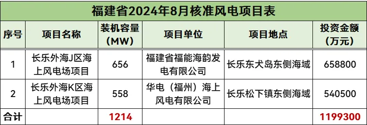 福建核準2個風電項目,總規模1214MW,總投資1199300萬元,均為海上風電項目。