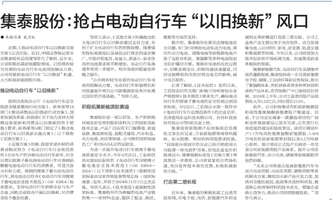 近期,《推動(dòng)電動(dòng)自行車以舊換新實(shí)施方案》正式印發(fā)。近日,中國(guó)證券報(bào)記者采訪集泰股份(或稱公司)董事兼總經(jīng)理鄒珍凡了解到,近年來(lái),公司積極拓展新能源膠領(lǐng)域,已經(jīng)擁有較為完善的電動(dòng)自行車電池用膠解決方案。公司將緊抓電動(dòng)自行車“以舊換新”機(jī)遇,大力拓展新能源膠市場(chǎng)。