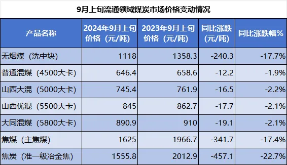 煤炭價格的變動對于鋼鐵、水泥及玻璃價格的變化也有一定的影響。2024年9月上旬,流通領域煤價較上年同期出現不同幅度下跌,其中焦炭同比下跌22.7%。4500~5800大卡動力煤同比跌幅在1.9%—2.2%之間。